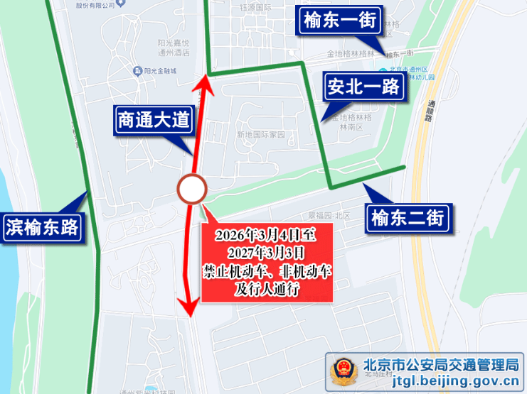 為保證地鐵M101線一期商務(wù)園站工程施工期間的道路交通安全與暢通,根據(jù)道路交通安全法律法規(guī)有關(guān)規(guī)定,決定通州區(qū)商通大道與榆東一街相交路口至商通大道與榆東二街相交路口南側(cè)160m范圍禁止機(jī)動車、非機(jī)動車及行人通行的交通管理措施延期至2027年3月3日,過往機(jī)動車、非機(jī)動車及行人可繞行臨時(shí)導(dǎo)改路至榆東二街、安北一路、榆東一街或?yàn)I榆東路、源盛北街等周邊道路通行。