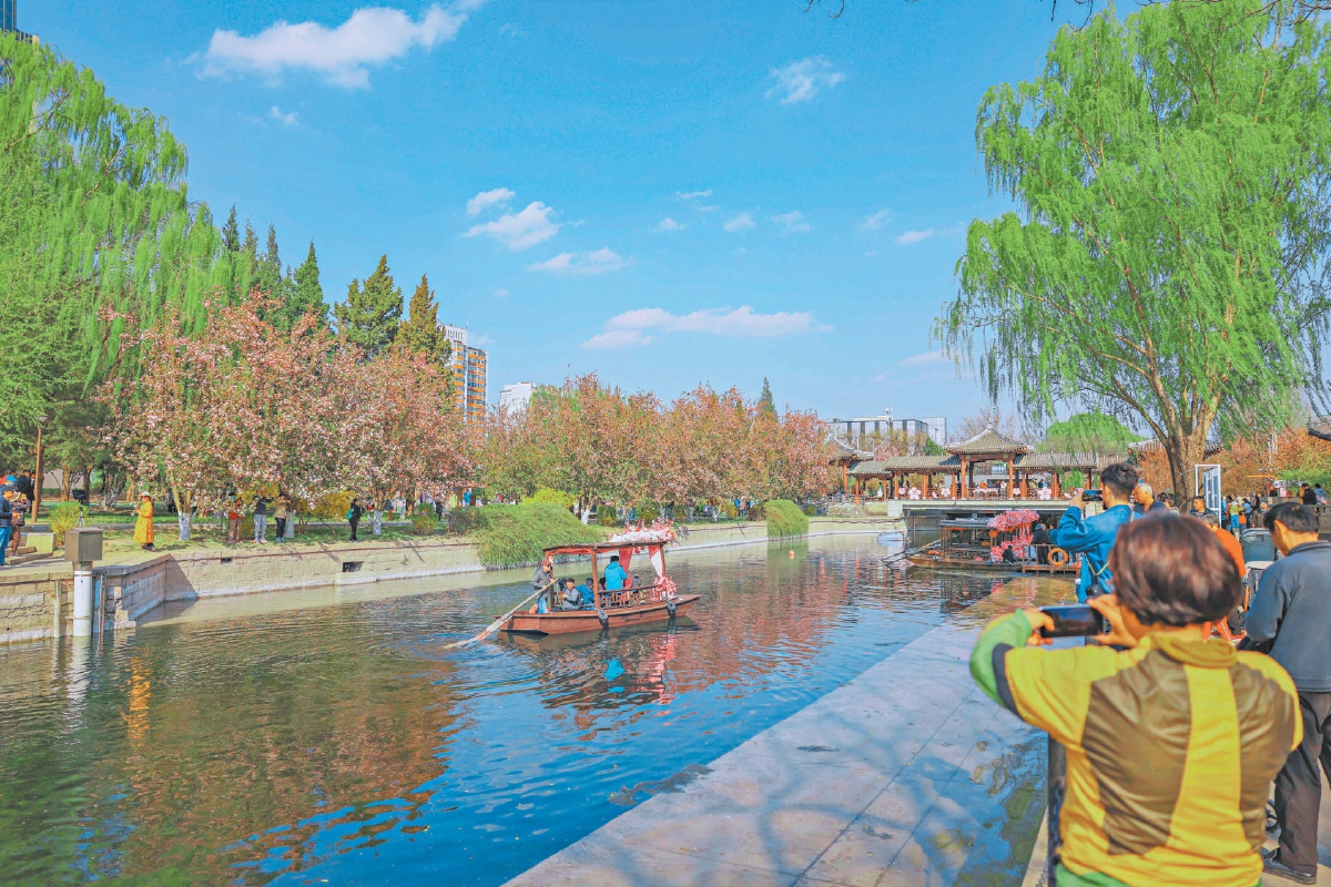 “開船嘍……”昨天下午,元大都城垣遺址公園東土城溝碼頭處,隨著一聲響亮的吆喝,船夫解開搖櫓船的繩索,船兒緩緩出發(fā),在粼粼波光中輕輕搖曳,與岸邊海棠相互映襯。從市水務(wù)局了解到,東土城溝國風(fēng)搖櫓船昨日試運行,今起正式運行,運營時間約半個月。不同于在濱水步道賞“海棠花溪”美景,市民游客坐于船中,可以在河道中更近距離感受“花溪入畫”的獨特魅力。