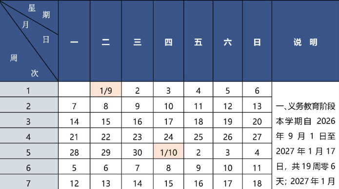 2027年1月17日(星期日)結(jié)束本學期工作,共19周零6天;