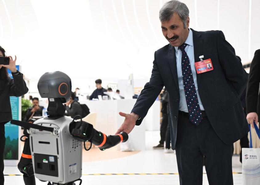2025中關(guān)村論壇年會(huì),與會(huì)嘉賓與機(jī)器人握手 來(lái)源:新華社
