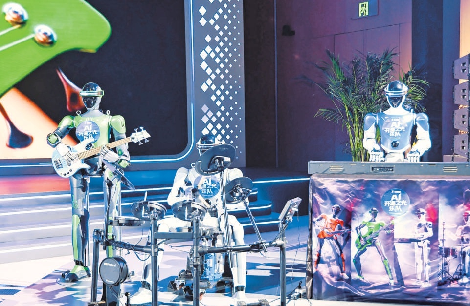 2026中關(guān)村論壇年會“人工智能主題日”活動現(xiàn)場,AI開源之光樂隊的機器人樂手演奏了一曲由AIGC創(chuàng)作的歌曲燃爆全場。(和冠欣 攝)
