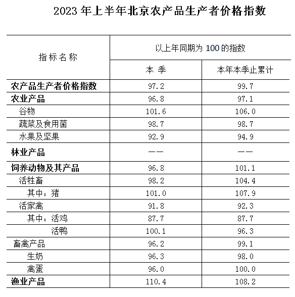 上半年,北京農(nóng)產(chǎn)品生產(chǎn)者價格總指數(shù)為99.7,價格同比下降0.3%。農(nóng)、牧、漁三大類農(nóng)產(chǎn)品價格“1降2升”,指數(shù)分別為97.1、101.1和108.2。