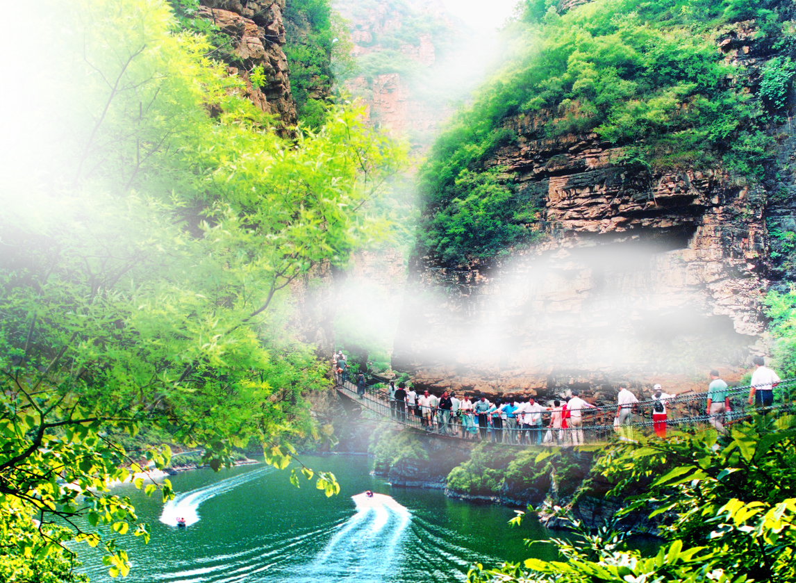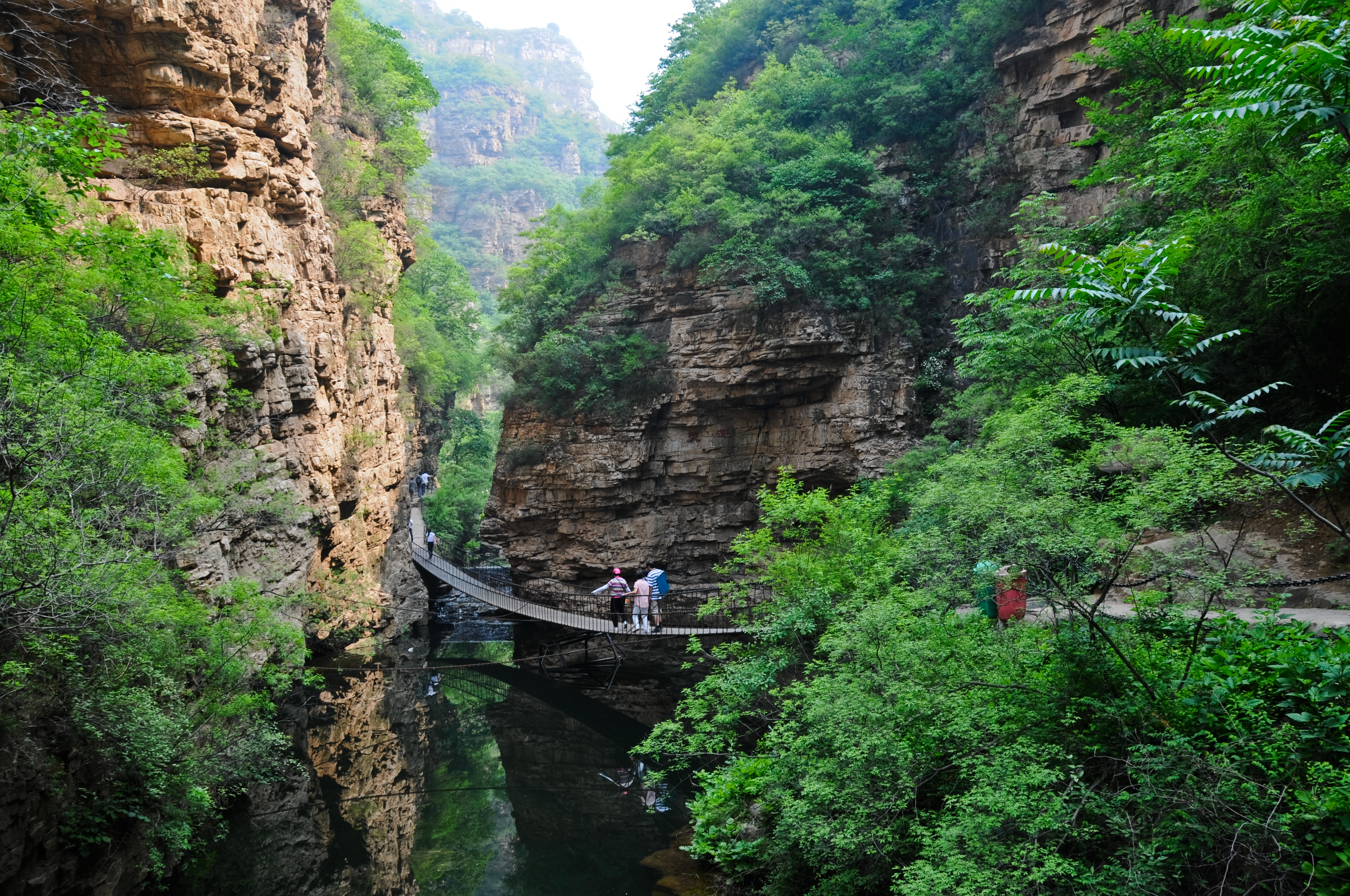 峽谷內(nèi)奇峰崢嶸,如利劍插天或似翠屏橫沉,忽高忽低,錯落成趣,更有山泉匯聚成潭,五眼潭水如五封明鏡鑲嵌谷中,人稱“京東奇景”,建于“萬丈崖”峭壁之上的玻璃棧道窄細悠長,行走其間,如凌云漫步,更為這奇景增添驚險趣味。