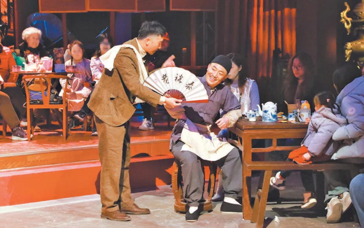將視線轉(zhuǎn)向繁華的王府井大街,同樣別開生面的場(chǎng)景正在舍予劇場(chǎng)上演。作為北京市曲劇團(tuán)駐演的全新空間,這里上演的沉浸式北京曲劇《京城拍賣會(huì)》,在老北京茶樓的氛圍中牢牢抓住了觀眾的心。觀眾換取的“銅板”是拍賣會(huì)的籌碼,也是解鎖劇情的關(guān)鍵道具。弦聲起,板鼓聲落,老舍筆下的京味人物次第登場(chǎng),觀眾在競(jìng)拍老物件的歡聲笑語中,品味著老北京的人情冷暖與悲歡離合。