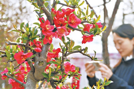 綻放的海棠花吸引游客欣賞、拍攝。