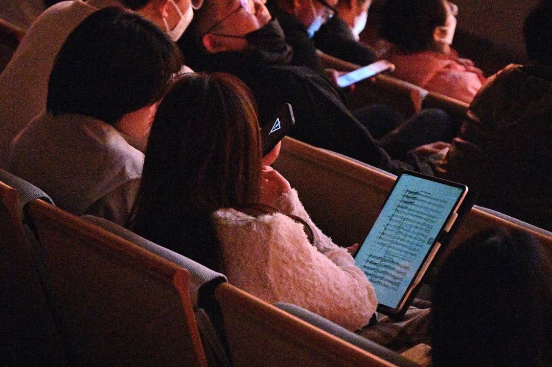 對照樂譜觀摩彩排的音樂學(xué)子們