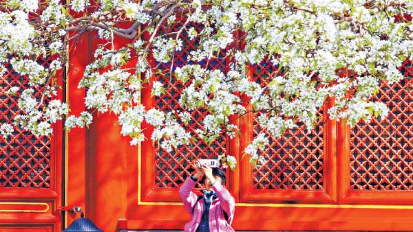 智化寺內(nèi),古梨樹雪白梨花如雪瀑傾瀉,與古剎紅墻相映成趣。