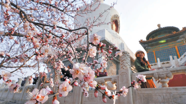 北海公園瓊?cè)A島的山桃與白塔形成經(jīng)典畫卷。