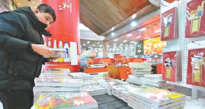 在中國書店琉璃廠店,讀者們喜氣洋洋,紛紛前來選購圖書以及龍元素的文創(chuàng)產(chǎn)品。中國書店琉璃廠店經(jīng)理劉易臣說,中國書店旗下近10家經(jīng)營門店,線上線下融合開展“舊書新知”專題展銷,其中有金石碑帖、古舊書版本學(xué)、經(jīng)典連環(huán)畫展銷等10余種古舊書專題展銷,為滿足讀者需求,中國書店整理出近萬個舊書品種。(路艷霞)