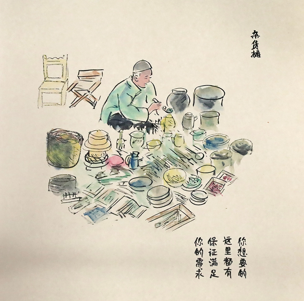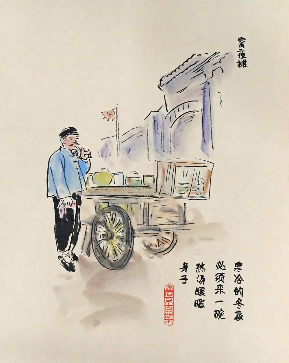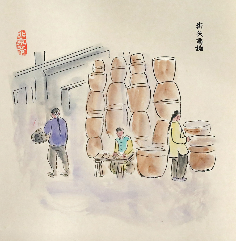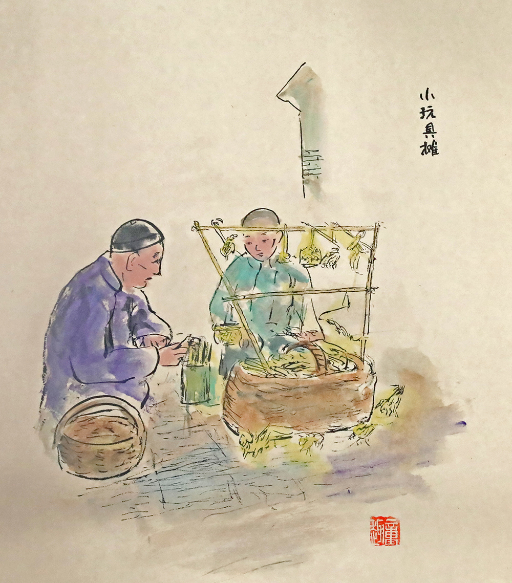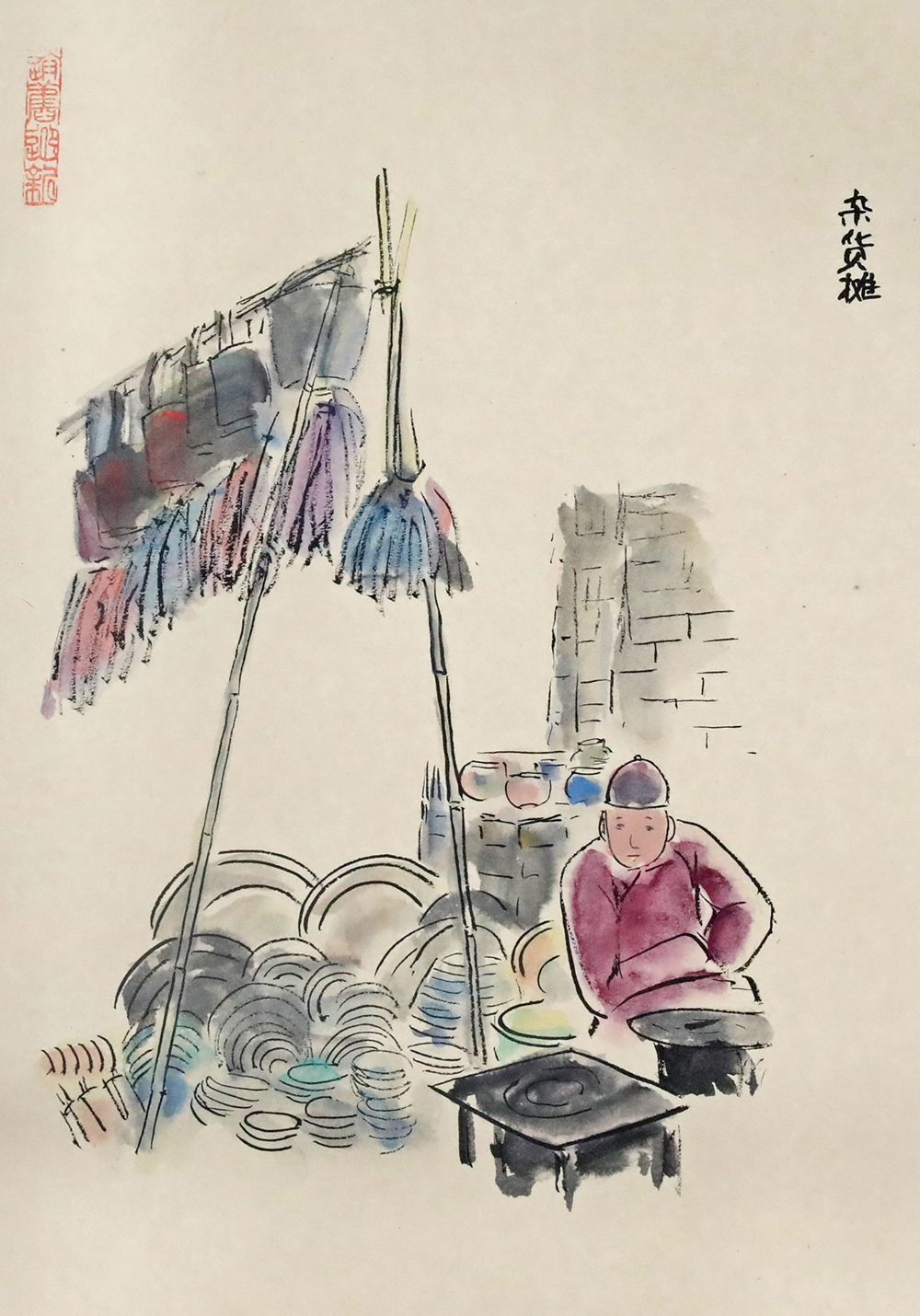歷史,不止記錄轟轟烈烈的故事,也記錄著不斷消失的記憶。以傳統(tǒng)國畫的方式去追憶老北京那些歲月時(shí)光里的商攤。(作者:陳惠展)