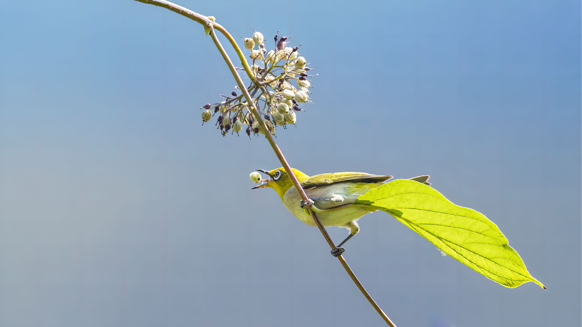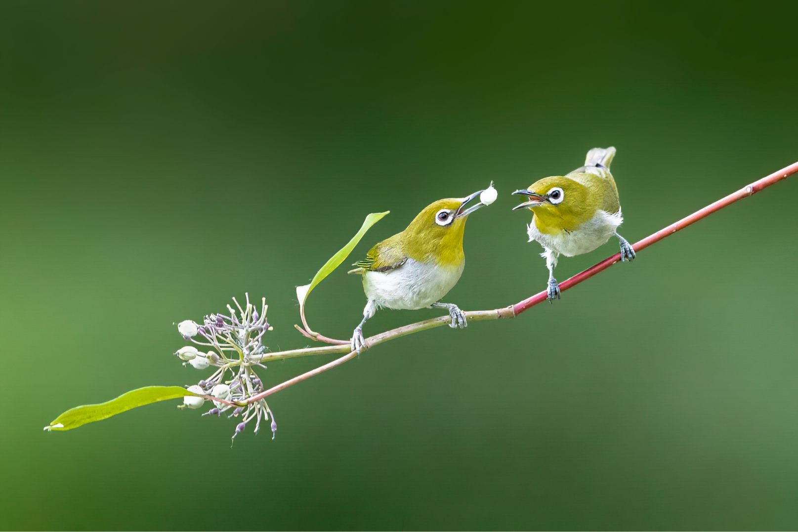 《繡眼的新裙》大興埝壇公園里的低地繡眼餐食紅瑞木果,葉子在尾部形成好看的裝飾,像美麗的裙擺。(攝影:王京華 )