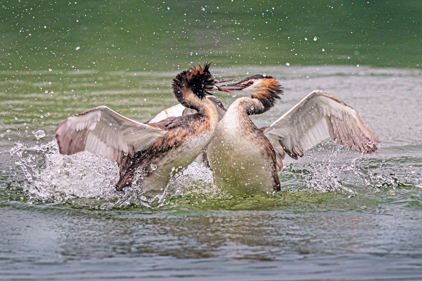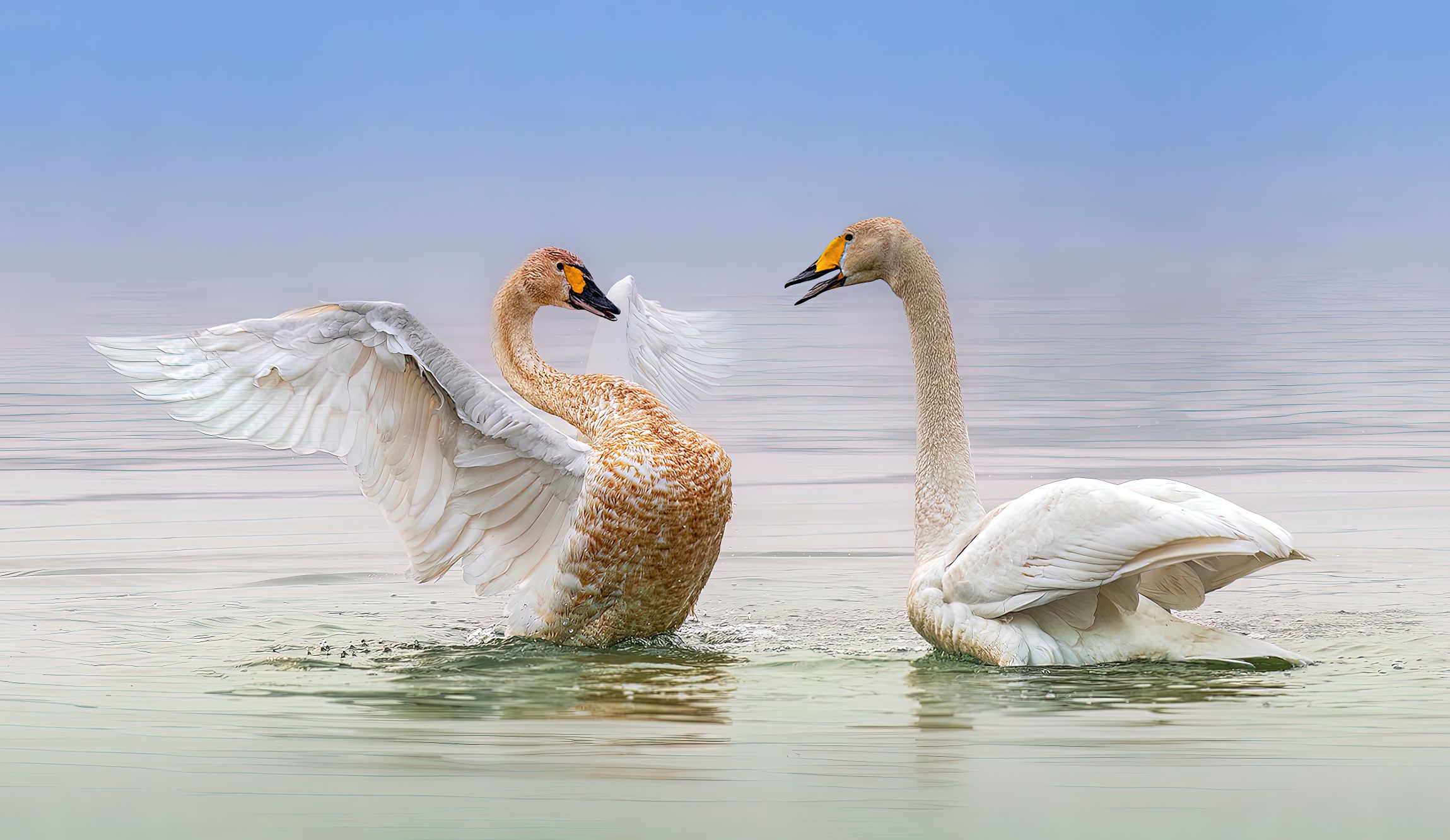 《惹人羨》天鵝在水面恣意嬉戲,依偎鳴叫,歡快無比。(攝影:潘清泉 )