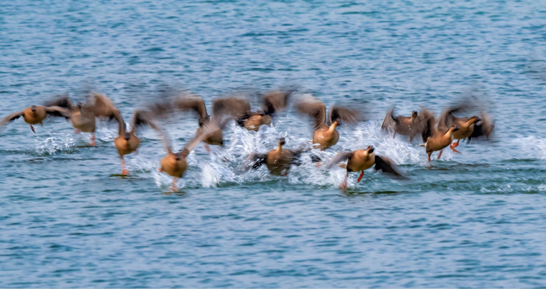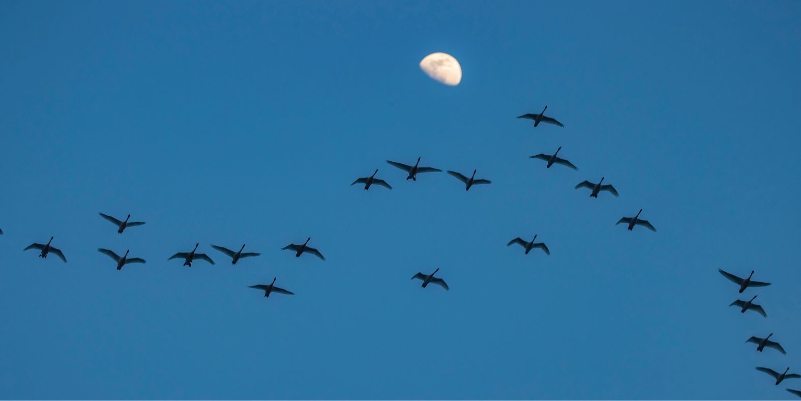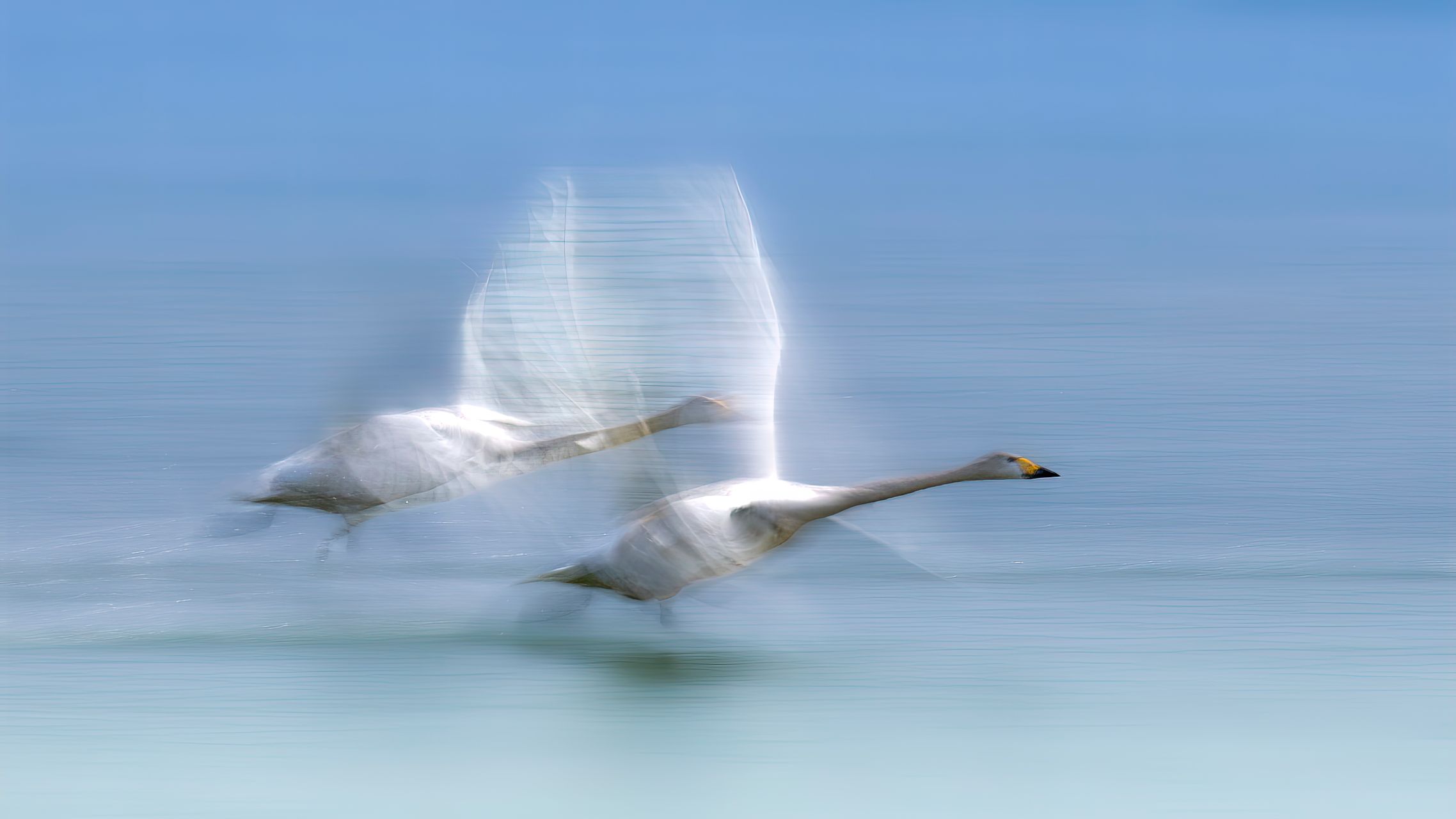 《競(jìng)飛》大興南海子公園,天鵝遷徙季。兩只天鵝貼著水面疾飛。(攝影:王京華 )