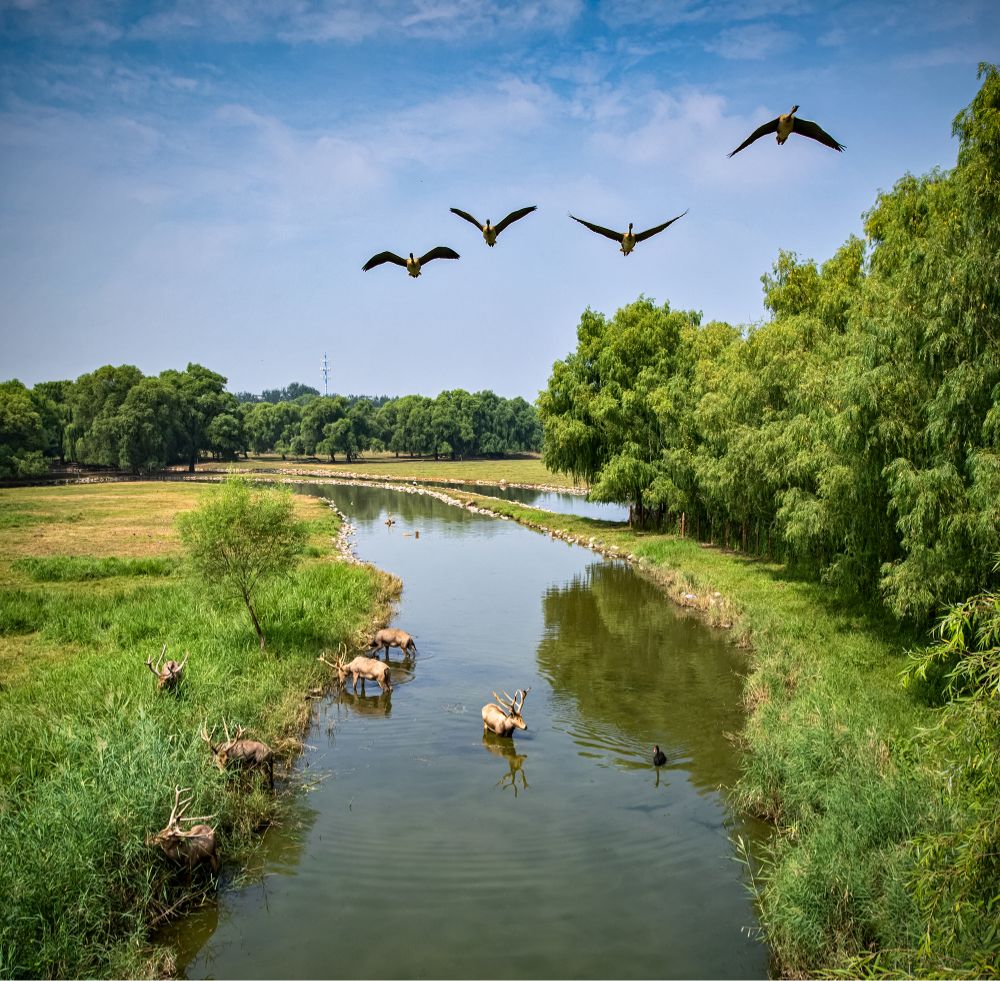《鹿苑秋韻》水洼濕地,鹿群覓食,水鳥高飛,一幅生態(tài)自然涵養(yǎng)圖。(攝影:陳志強(qiáng) )