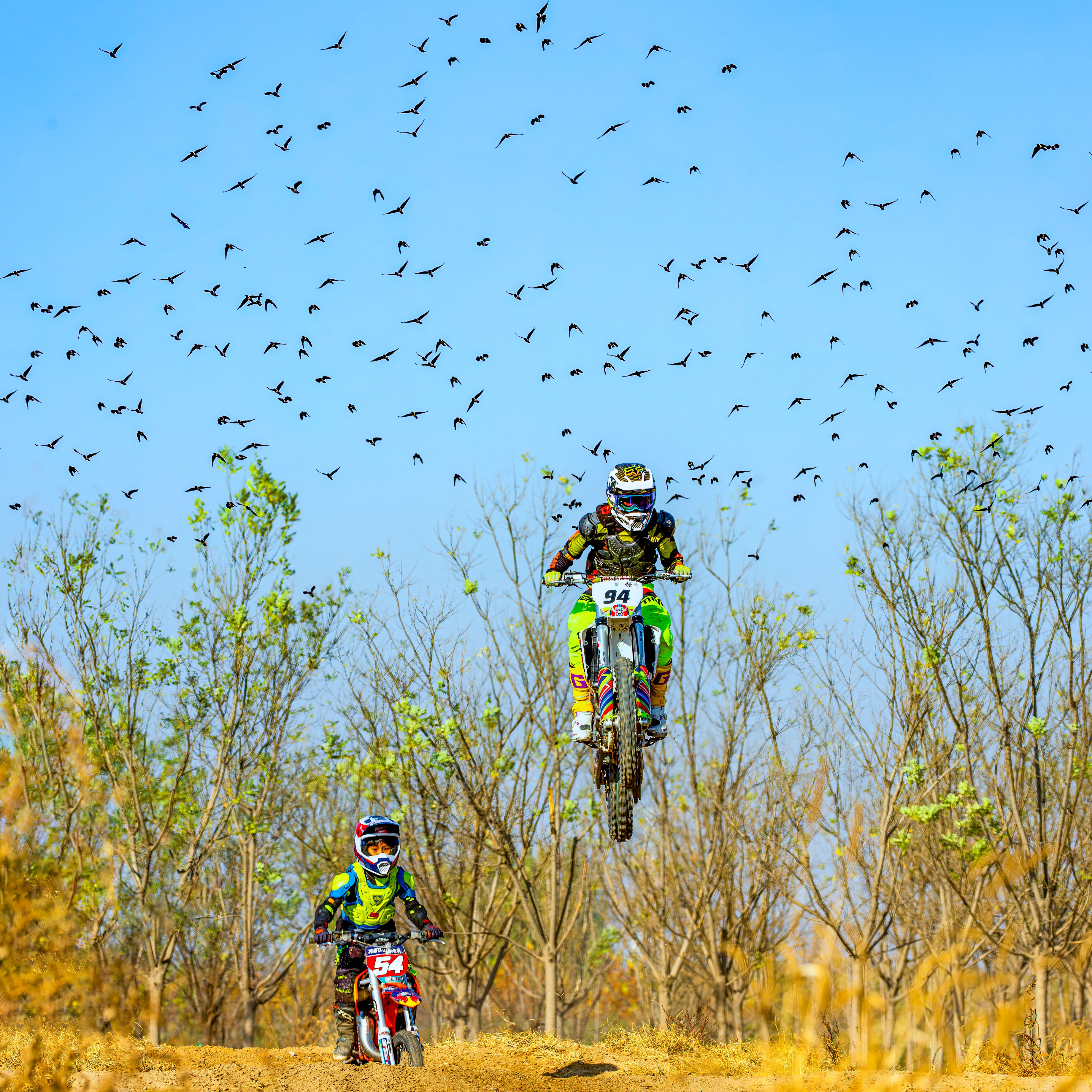 《有志不在年高 》永定河畔摩托車教練場(chǎng),群鳥伴隨著摩托車手飛馳電掣。(攝影:劉景波 )