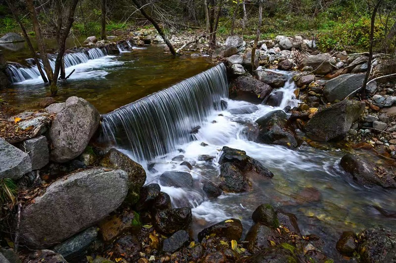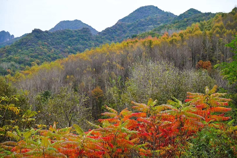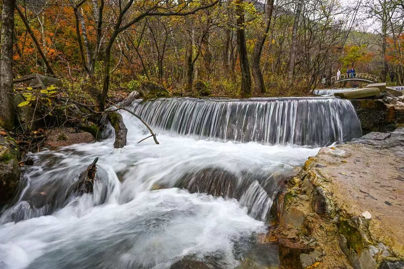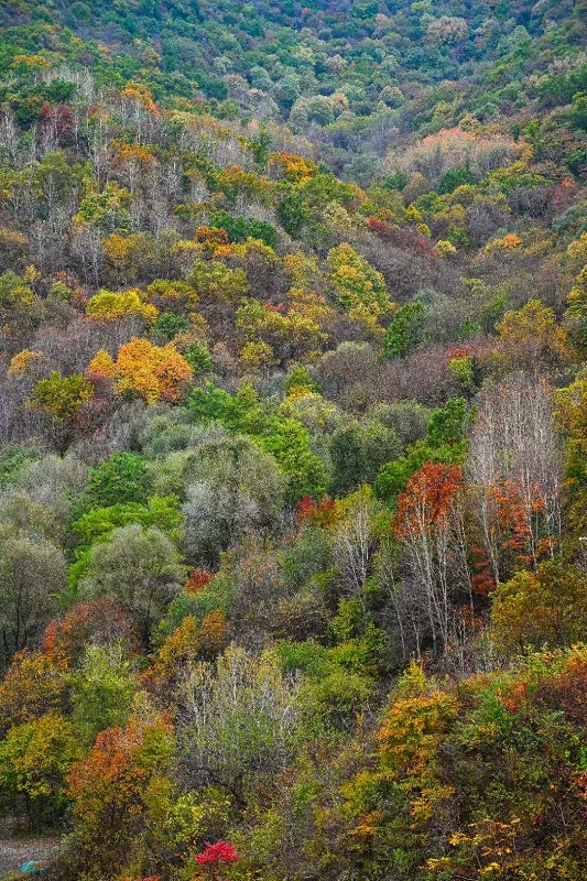 進入十月,玉渡山風景區(qū)已是層林盡染,山林色彩漸變交織,白樺樹的葉片變成了金黃色,落葉鋪滿了山間小路。在海拔1500米的森林里,成片的紅葉為這幅秋日畫卷添上了迷人的色彩。山頂?shù)牟莸?,視野開闊,遠處的群山連綿起伏,山上的樹木五彩斑斕。穿過山林,潺潺流水匯成碧綠的水潭,格外清澈,形成一幅“碧水映秋” 的絕美畫面。
