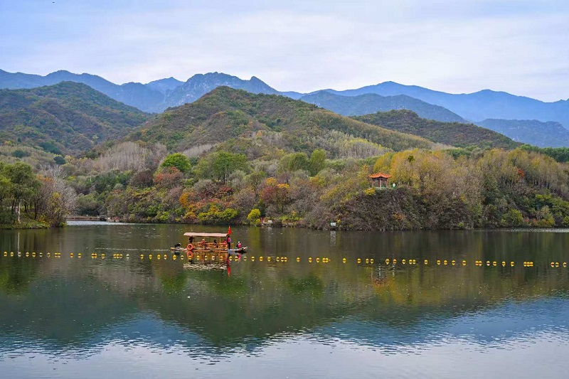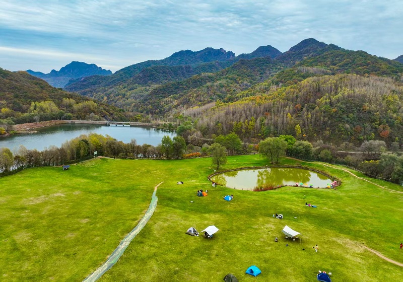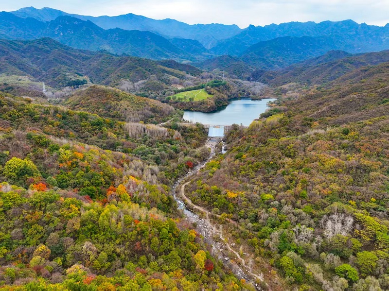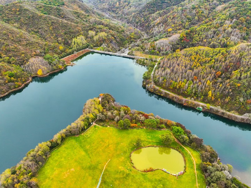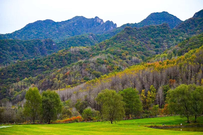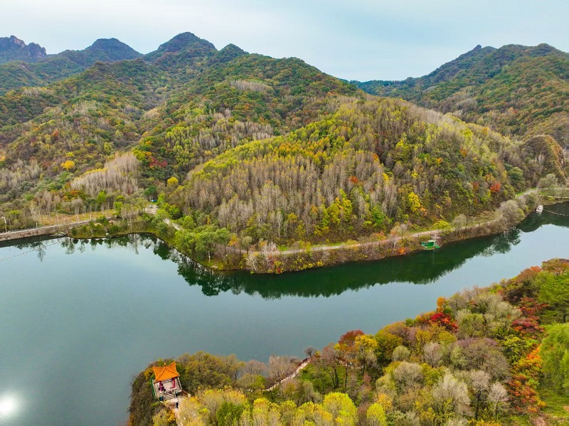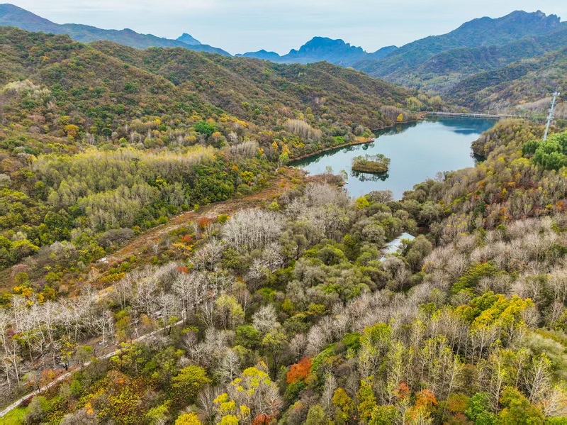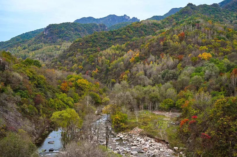 進入十月,玉渡山風景區(qū)已是層林盡染,山林色彩漸變交織,白樺樹的葉片變成了金黃色,落葉鋪滿了山間小路。在海拔1500米的森林里,成片的紅葉為這幅秋日畫卷添上了迷人的色彩。山頂?shù)牟莸椋曇伴_闊,遠處的群山連綿起伏,山上的樹木五彩斑斕。穿過山林,潺潺流水匯成碧綠的水潭,格外清澈,形成一幅“碧水映秋” 的絕美畫面。