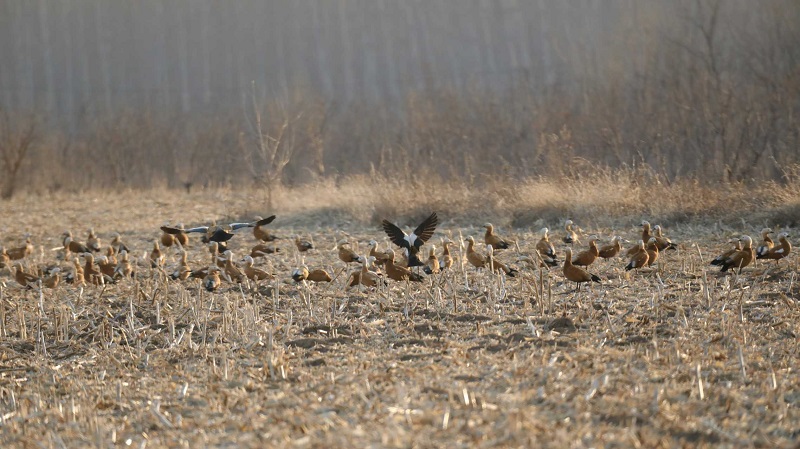 赤麻鴨每天下午三點以后陸續(xù)飛到水庫周邊玉米地休息。(攝影:李愛宏)