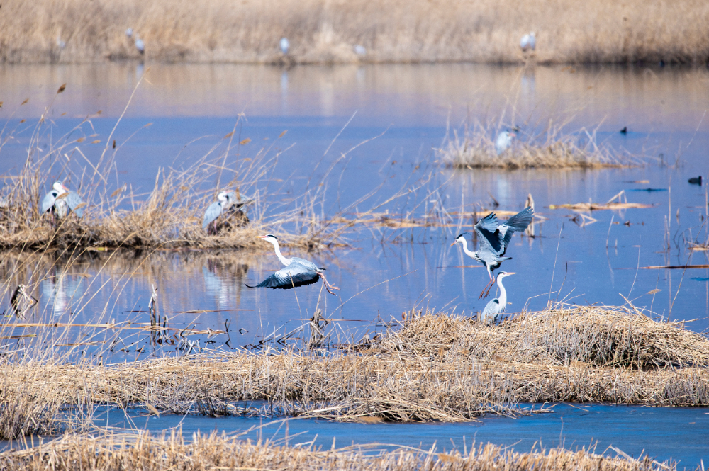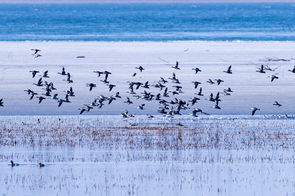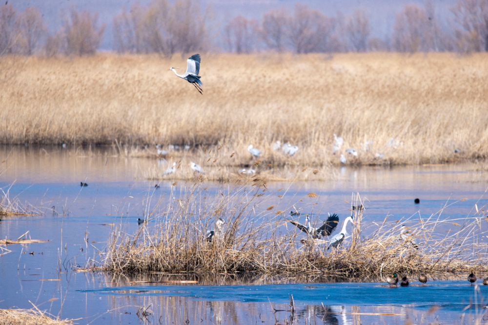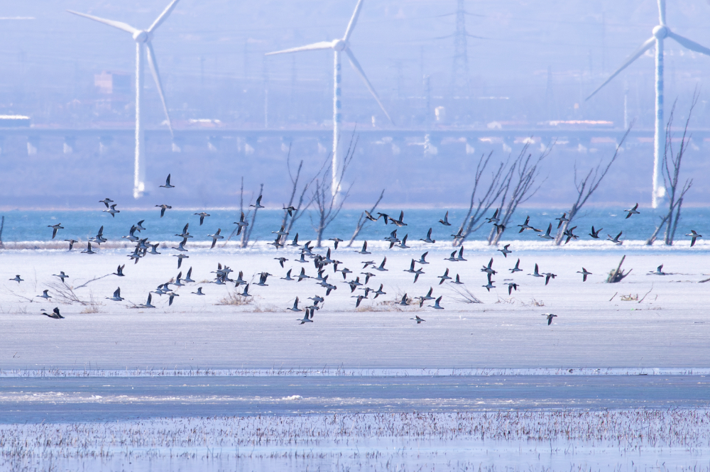 春回大地,草木萌發(fā),北京野鴨湖國際重要濕地即將迎來春季候鳥遷徙高峰。目前,野鴨湖內有兩千余只豆雁集結待發(fā),花臉鴨、小天鵝等國家二級保護鳥類各千余只在此棲息,白骨頂、鳳頭??也紛紛回歸棲息繁殖地。普通鸕鶿、紅嘴鷗、白尾海雕等鳥類也在湖區(qū)嬉戲翱翔。據悉,3月中旬將進入遷徙高峰,預計屆時過境鳥類可達數萬余只,數十種遷徙候鳥在此停歇補給,形成“萬鳥翔集、千羽游弋”的壯觀景象。(攝影:李曉鵬)