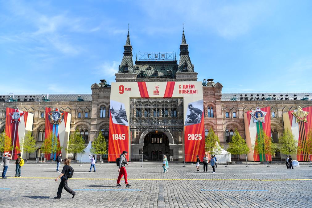 ??紀(jì)念蘇聯(lián)偉大衛(wèi)國(guó)戰(zhàn)爭(zhēng)勝利80周年慶典前夕,莫斯科街頭,寫有“勝利”字樣的旗幟隨風(fēng)飄揚(yáng)。在路邊,以蘇聯(lián)衛(wèi)國(guó)戰(zhàn)爭(zhēng)歷史為主題的圖片展板和裝飾櫥窗吸引行人停下腳步,或合影留念,或?yàn)g覽沉思。