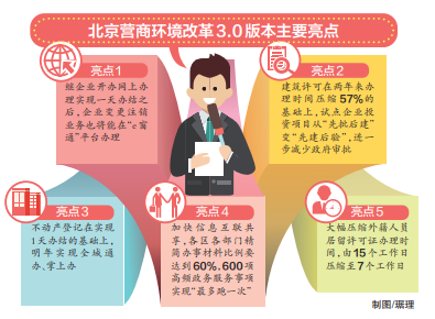 北京營商環(huán)境再迎來一次飛躍。11月12日,市發(fā)展改革委、市規(guī)劃自然資源委等部門聯(lián)合召開新聞發(fā)布會,介紹北京營商改革3.0版的具體政策及亮點(diǎn)。這是北京不到兩年時間里推出的第三版改革政策。3.0版改革主要包括12個方面204項(xiàng)任務(wù),數(shù)量超過前兩版總和,內(nèi)容更廣、范圍更寬、任務(wù)更重。