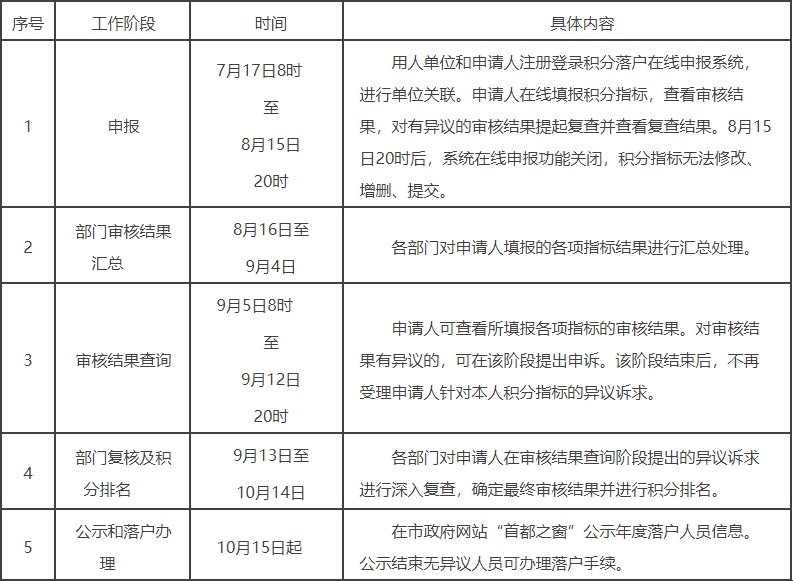 本市積分落戶工作為年度申報制。2020年申報工作分為申報、部門審核結(jié)果匯總、審核結(jié)果查詢、部門復(fù)核及積分排名、公示和落戶辦理5個階段。各階段安排如下: